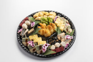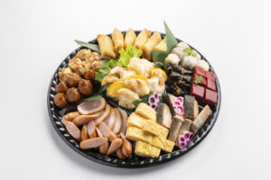 煮物、鮭幽庵焼き、出汁巻、鶏天、エビフライ、よもぎ麩、枝豆などが入った和風オードブルです。町内会の集まり・運動会・送別会・歓迎会・懇親会・忘年会・謝恩会など、様々なお集まりにて人気の商品です。