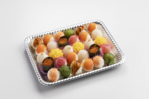 華やかなお集まりに人気な手まり寿司をワンプレートにギュッと盛り込みました。マグロ・サーモン・イカ・イクラ・鯛・穴子など、人気だけでなく美味しい食材を握っています。